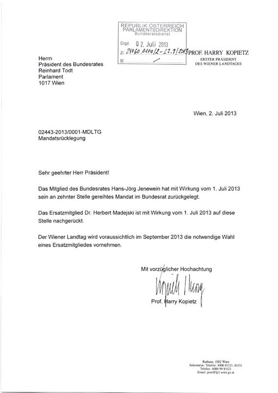 Schreiben des Präsidenten des Wiener Landtages betreffend Mandatsverzicht des Bundesrates Hansjörg Jenewein ....................................................................................................................... 27
