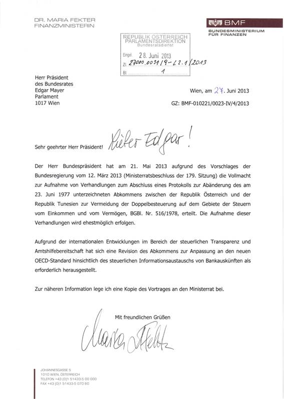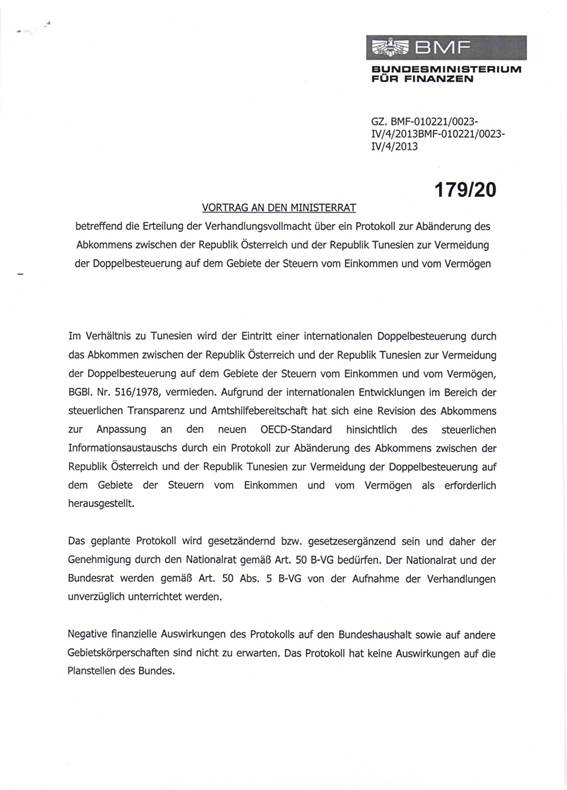 Schreiben der Bundesministerin für Finanzen gemäß Artikel 50 Abs. 5 Bundes-Verfassungsgesetz betreffend Erteilung der Vollmacht zur Aufnahme von Verhandlungen zum Abschluss eines Protokolls zur Abänderung des am 23. Juni 1977 unterzeichneten Abkommens zwischen der Republik Österreich und der Republik Tunesien zur Vermeidung der Doppelbesteuerung auf dem Gebiete der Steuern vom Einkommen und vom Vermögen, BGBl. Nr. 516/1978, durch den Herrn Bundespräsidenten ......................... 48