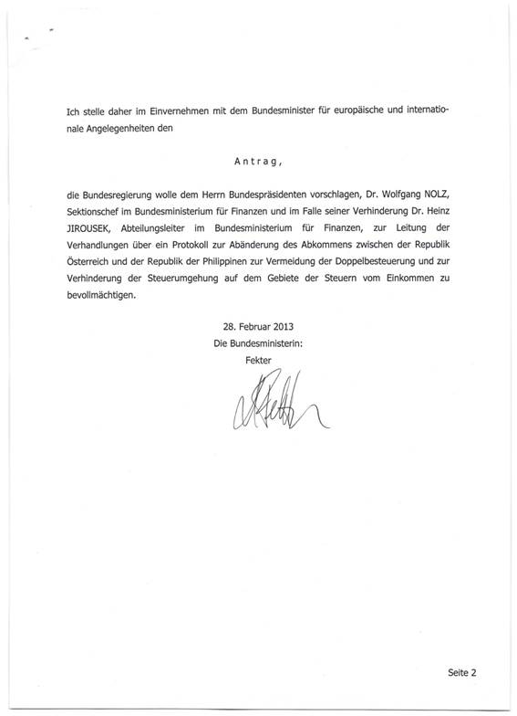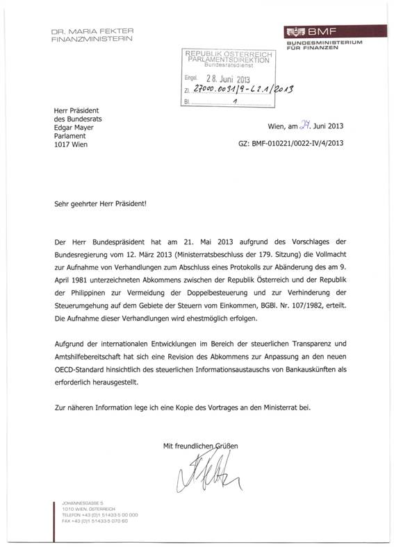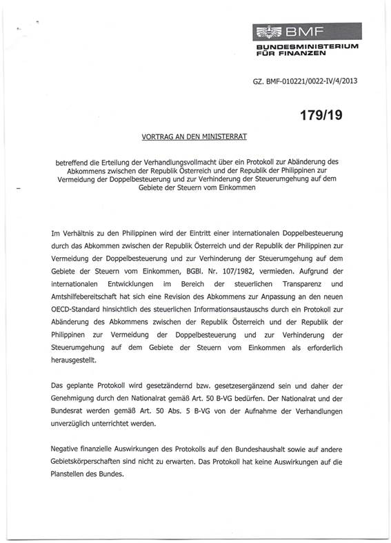 Schreiben der Bundesministerin für Finanzen gemäß Artikel 50 Abs. 5 Bundes-Verfassungsgesetz betreffend Erteilung der Vollmacht zur Aufnahme von Verhandlungen zum Abschluss eines Protokolls zur Abänderung des am 9. April 1981 unterzeichneten Abkommens zwischen der Republik Österreich und der Republik der Philippinen zur Vermeidung der Doppelbesteuerung und zur Verhinderung der Steuerumgehung auf dem Gebiete der Steuern vom Einkommen, BGBl. Nr. 107/1982, durch den Herrn Bundespräsidenten ............................................................................................................................... 51