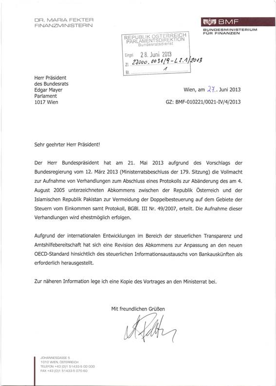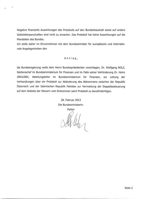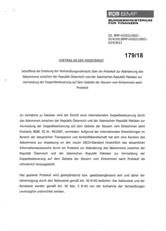 Schreiben der Bundesministerin für Finanzen gemäß Artikel 50 Abs. 5 Bundes-Verfassungsgesetz betreffend Erteilung der Vollmacht zur Aufnahme von Verhandlungen zum Abschluss eines Protokolls zur Abänderung des am 4. August 2005 unterzeichneten Abkommens zwischen der Republik Österreich und der Islamischen Republik Pakistan zur Vermeidung der Doppelbesteuerung auf dem Gebiete der Steuern vom Einkommen samt Protokoll, BGBl. III Nr. 49/2007, durch den Herrn Bundespräsidenten ................. 54
