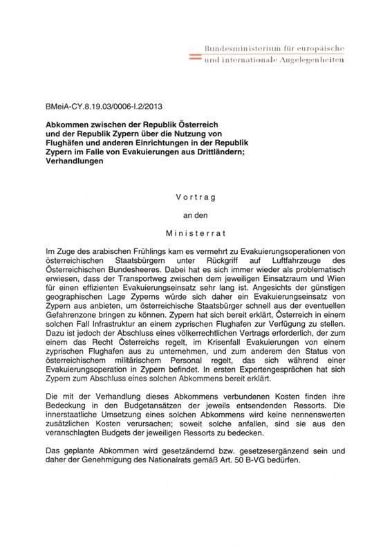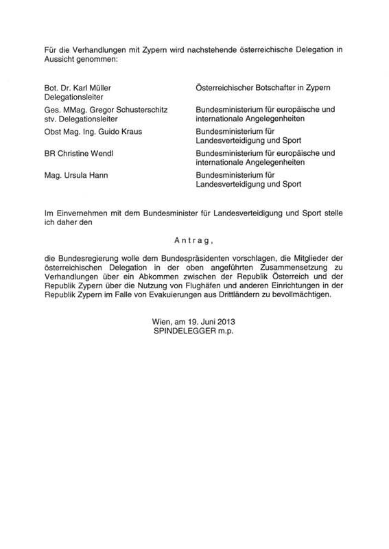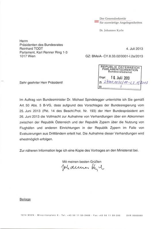 Schreiben des Generalsekretärs für auswärtige Angelegenheiten Dr. Johannes Kyrle gemäß Artikel 50 Abs. 5 Bundes-Verfassungsgesetz betreffend Erteilung der Vollmacht zur Aufnahme von Verhandlungen über ein Abkommen zwischen der Republik Österreich und der Republik Zypern über die Nutzung von Flughäfen und anderen Einrichtungen in der Republik Zypern im Falle von Evakuierungen aus Drittländern durch den Herrn Bundespräsidenten ........................................................................................................ 57