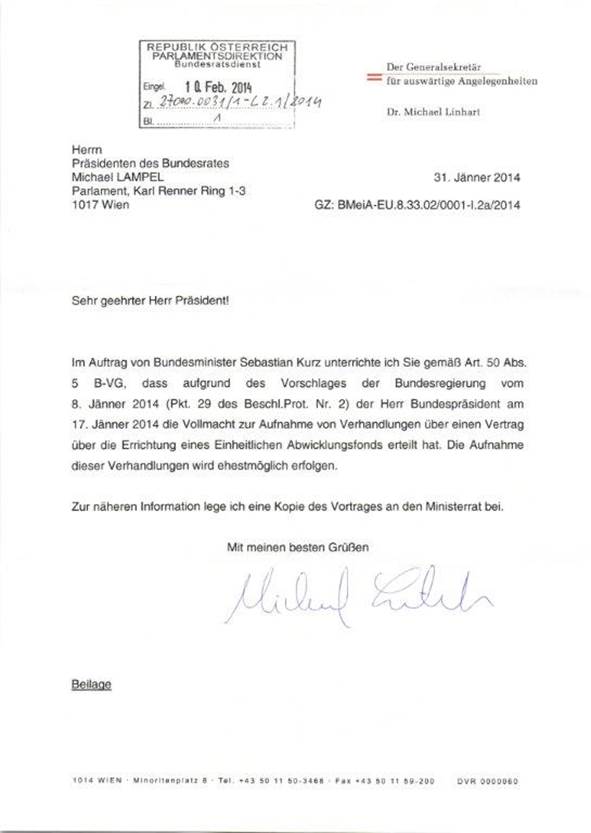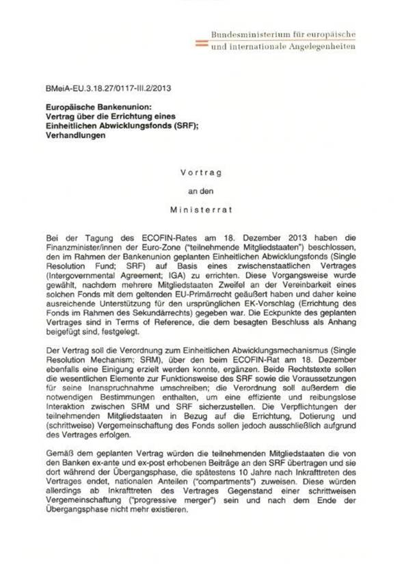 Aufnahme von Verhandlungen über einen Vertrag über die Errichtung eines Einheitlichen Abwicklungsfonds durch den Herrn Bundespräsidenten ............................................................................................................................... 24