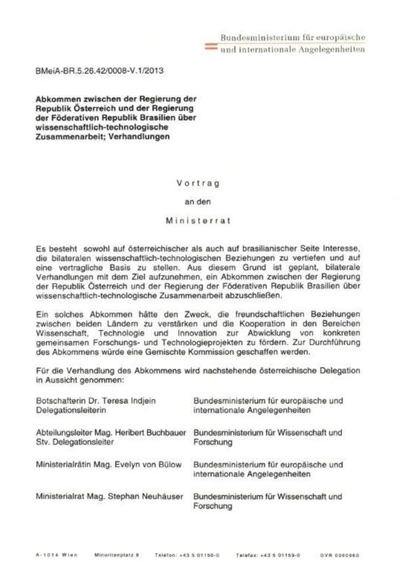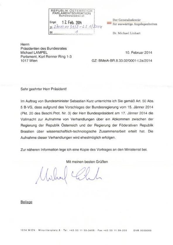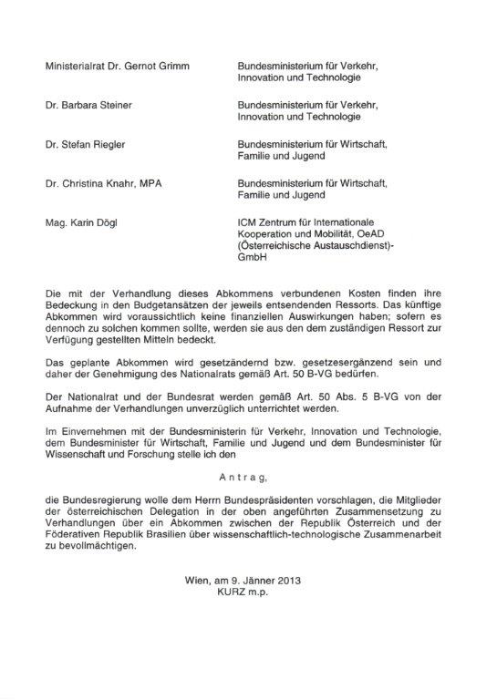 Schreiben des Generalsekretärs für auswärtige Angelegenheiten gemäß Artikel 50 Abs. 5 Bundes-Verfassungsgesetz betreffend Erteilung der Vollmacht zur Aufnahme von Verhandlungen über ein Abkommen zwischen der Regierung der Republik Österreich und der Regierung der Föderativen Republik Brasilien über wissenschaftlich-technologische Zusammenarbeit durch den Herrn Bundespräsidenten 28