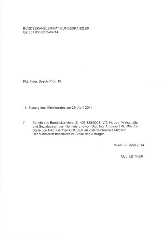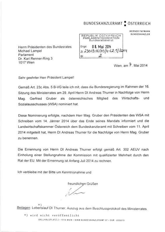 Schreiben des Bundeskanzlers gemäß Artikel 23c Abs. 5 Bundes-Verfassungsgesetz betreffend Nominierung eines österreichischen Mitgliedes des Wirtschafts- und Sozialausschusses 33