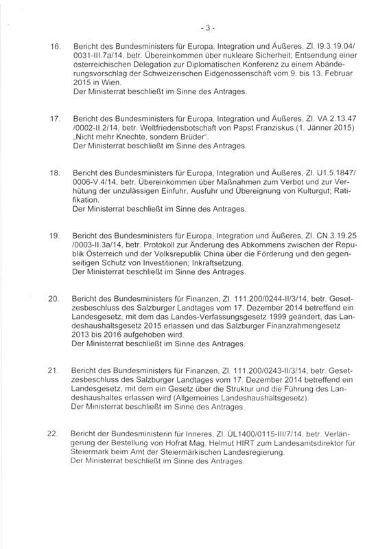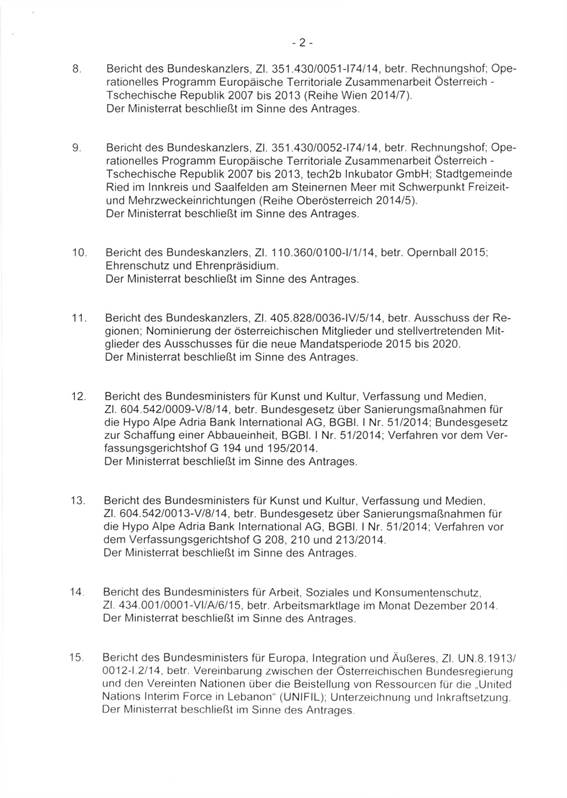 Die Einberufung der nächsten Sitzung des Bundesrates wird auf schriftlichem Wege erfolgen. Als Sitzungstermin ist Donnerstag, der 12. März 2015, 9 Uhr, in Aussicht genommen.