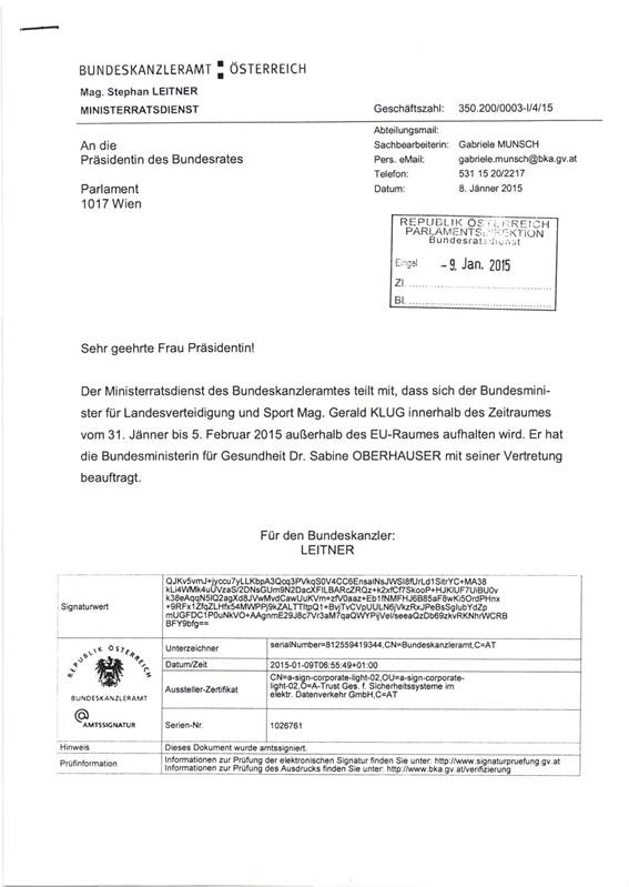 Schreiben des Bundeskanzleramtes betreffend Aufenthalt eines Mitgliedes der Bundesregierung in einem anderen Mitgliedstaat der Europäischen Union .............................................................. 59