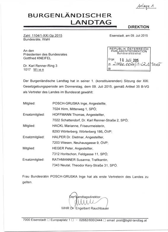Präsident Gottfried Kneifel: Ich gebe noch bekannt, dass seit der letzten beziehungsweise in der heutigen Sitzung insgesamt vier Anfragen, 3083/J-BR/2015 bis 3086/J-BR/2015, eingebracht wurden.