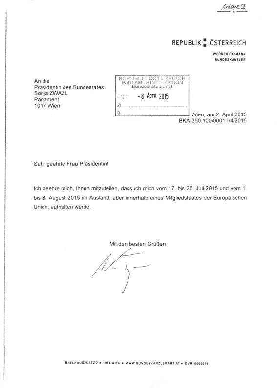 Schreiben des Bundeskanzlers betreffend seinen Aufenthalt in einem anderen Mitgliedstaat der Europäischen Union .................................................................................................. 39