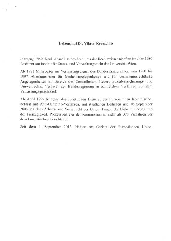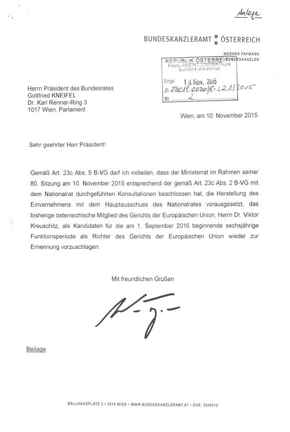 Schreiben des Bundeskanzlers betreffend neuerliche Nominierung des österreichischen Mitgliedes des Gerichtes der Europäischen Union als Kandidaten als Richter gemäß Artikel 23c Abs. 5 Bundes-Verfassungsgesetz ......................................................................................................... 31