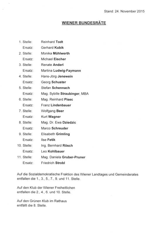Aufgrund des Ausscheidens von Mitgliedern und Ersatzmitgliedern des Bundesrates sind 2 Mitglieder und 5 Ersatzmitglieder neu zu wählen, wobei 1 Mitglied und 2 Ersatzmitglieder von der ÖVP, 1 Mitglied und 2 Ersatzmitglieder von der SPÖ und 1 Ersatzmitglied von der FPÖ für die entsprechende Wahl vorzuschlagen sind.