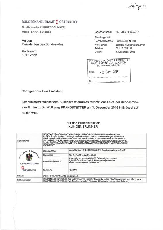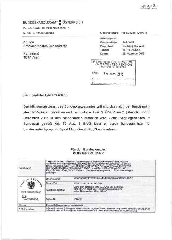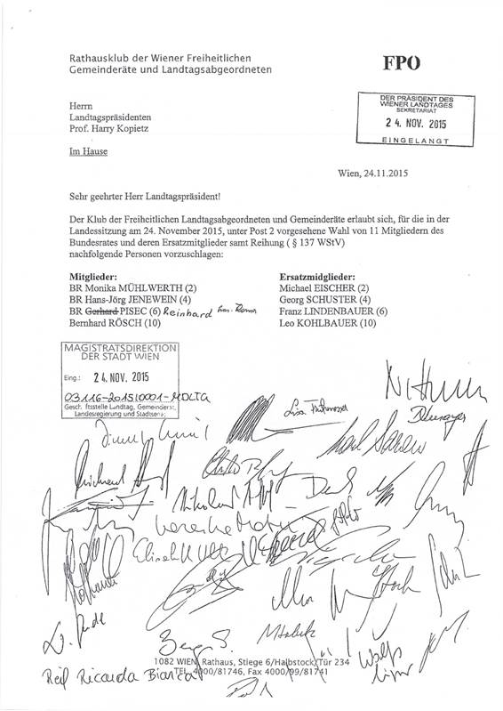 Präsident Gottfried Kneifel: Ich gebe noch bekannt, dass seit der letzten beziehungsweise in der heutigen Sitzung insgesamt eine Anfrage, nämlich die Anfrage 3099/J-BR/2015, eingebracht wurde.