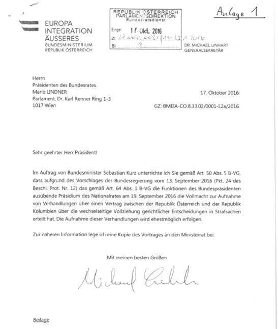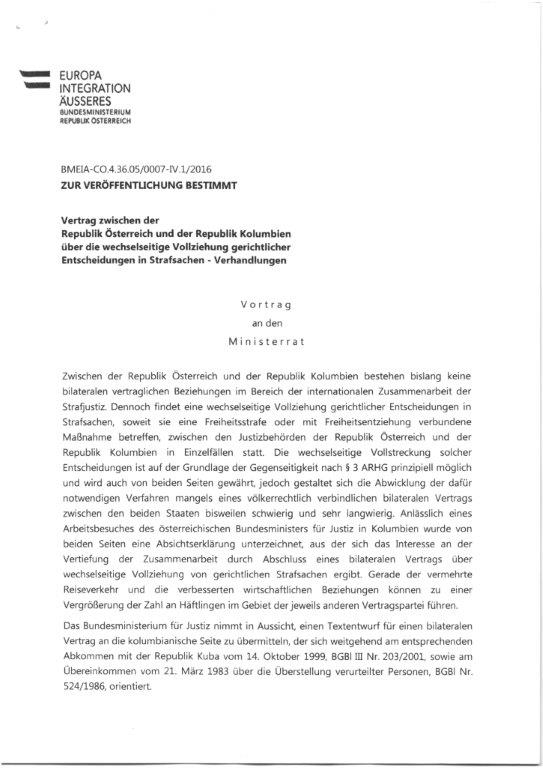 zur Aufnahme von Verhandlungen über einen Vertrag zwischen der Republik Österreich und der Republik Kolumbien über die wechselseitige Vollziehung gerichtlicher Entscheidungen in Strafsachen durch das gemäß Artikel 64 Abs. 1 BV-G die Funktionen des Bundespräsidenten ausübende Präsidium des Nationalrates ........................................ 32