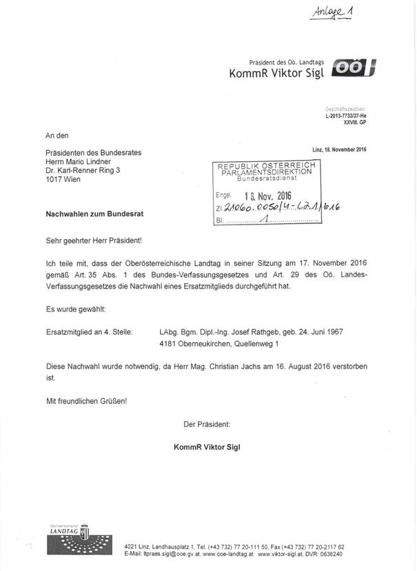 Weiters eingelangt ist ein Schreiben des Oberösterreichischen Landtages betreffend Wahl eines Ersatzmitgliedes des Bundesrates und
