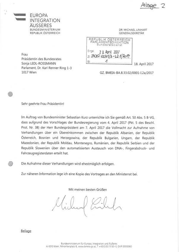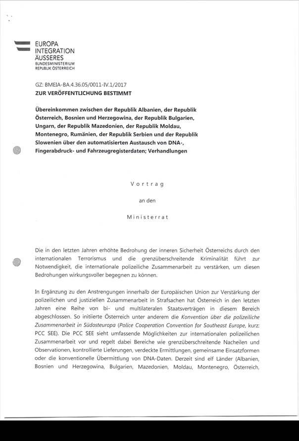 Republik Serbien und der Republik Slowenien über den automatisierten Austausch von DNA-, Fingerabdruck- und Fahrzeugregisterdaten durch den Herrn Bundespräsidenten ................................. 45