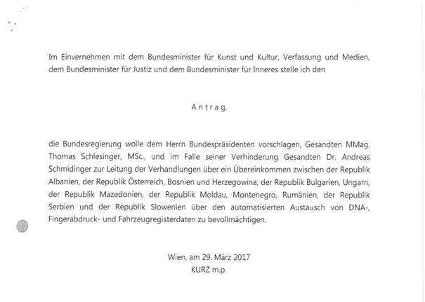 Schreiben des Generalsekretärs für auswärtige Angelegenheiten gemäß Artikel 50 Abs. 5 Bundes-Verfassungsgesetz betreffend Erteilung der Vollmacht zur Aufnahme von Verhandlungen über ein Abkommen zwischen der Republik Albanien, der Republik Österreich, Bosnien und Herzegowina, der Republik Bulgarien, Ungarn, der Republik Mazedonien, der Republik Moldau, Montenegro, Rumänien, der