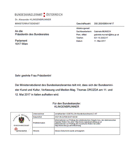 Schreiben des Bundeskanzleramtes betreffend Aufenthalt eines Mitgliedes der Bundesregierung in einem anderen Mitgliedstaat der Europäischen Union ............................................................. 50