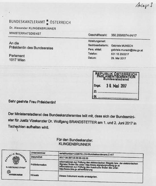 Schreiben des Bundeskanzleramtes betreffend Aufenthalt von Mitgliedern der Bundesregierung in einem anderen Mitgliedstaat der Europäischen Union ...................................................... 33, 34