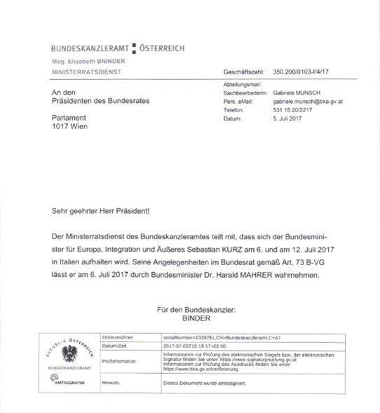 Schreiben des Bundeskanzleramtes betreffend Aufenthalt eines Mitgliedes der Bundesregierung in einem anderen Mitgliedstaat der Europäischen Union ............................................................. 34