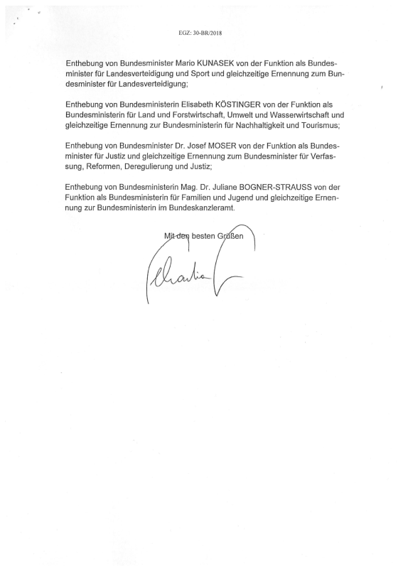 eines Schreibens von Bundeskanzler Sebastian Kurz betreffend Amtsenthebung beziehungsweise Ernennung von Mitgliedern der Bundesregierung aufgrund der am 8. Jänner 2018 in Kraft getretenen Bundesministeriengesetz-Novelle 2017 durch den Herrn Bundespräsidenten sowie