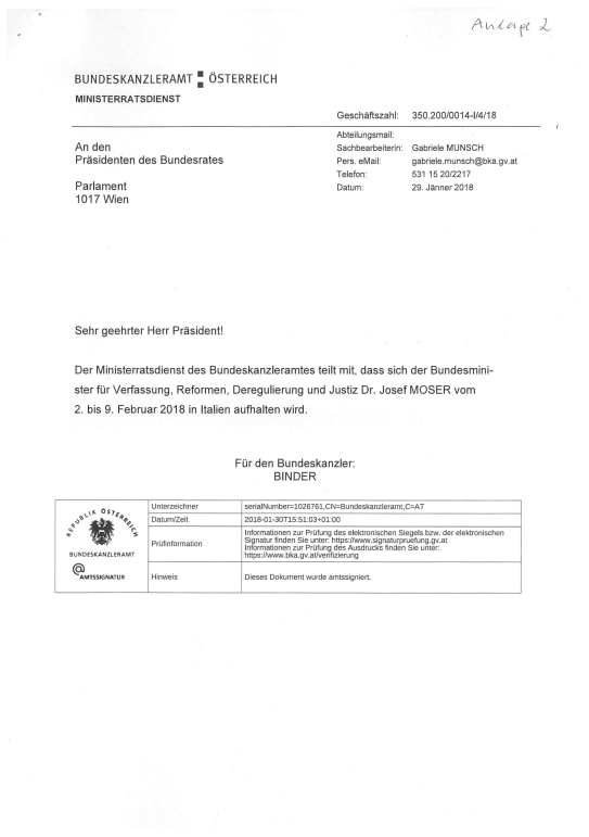 Schreiben des Ministerratsdienstes des Bundeskanzleramtes betreffend den Auslandsaufenthalt von Bundesminister für Verfassung, Reformen, Deregulierung und Justiz Dr. Josef Moser vom 2. bis 9. Februar 2018 in Italien (Anlage 2)