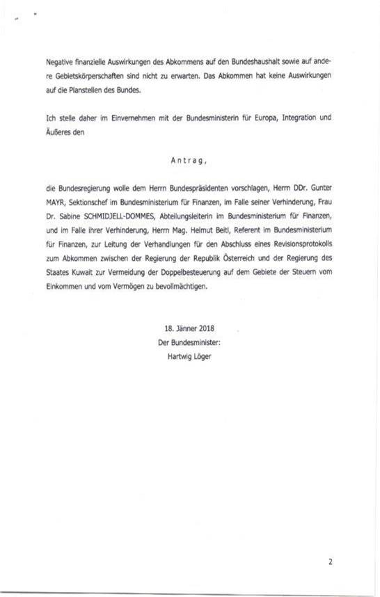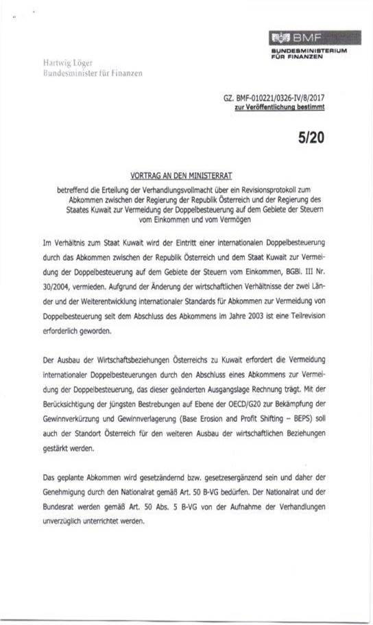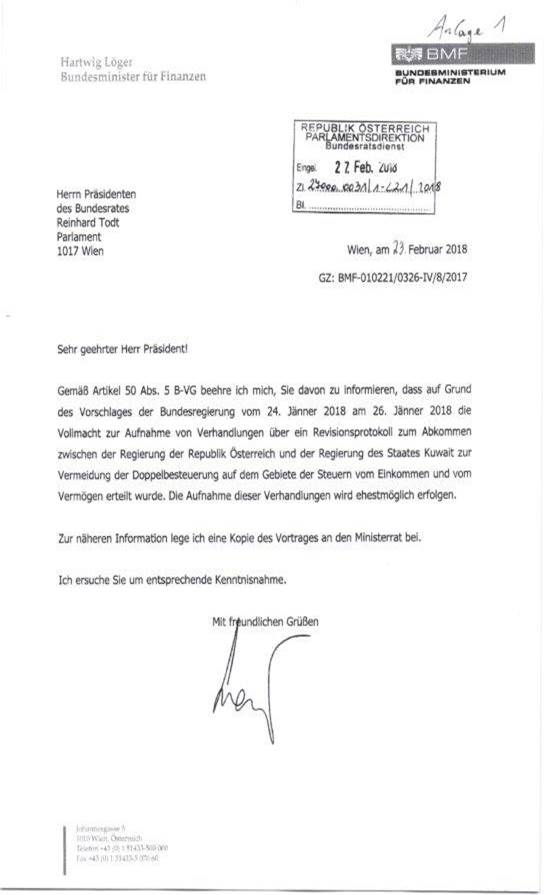 Schreiben des Bundesministers für Finanzen gemäß Art. 50 Abs. 5 B-VG betreffend Erteilung der Vollmacht zur Aufnahme von Verhandlungen über ein Revisionsprotokoll zum Abkommen zwischen der Regierung der Republik Österreich und der Regierung des Staates Kuwait zur Vermeidung der Doppelbesteuerung auf dem Gebiete der Steuern vom Einkommen und vom Vermögen ......................................... 37