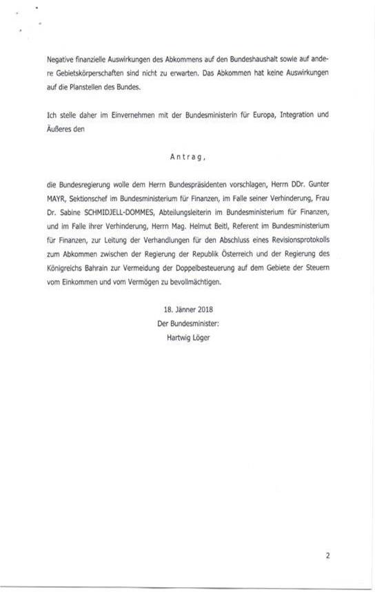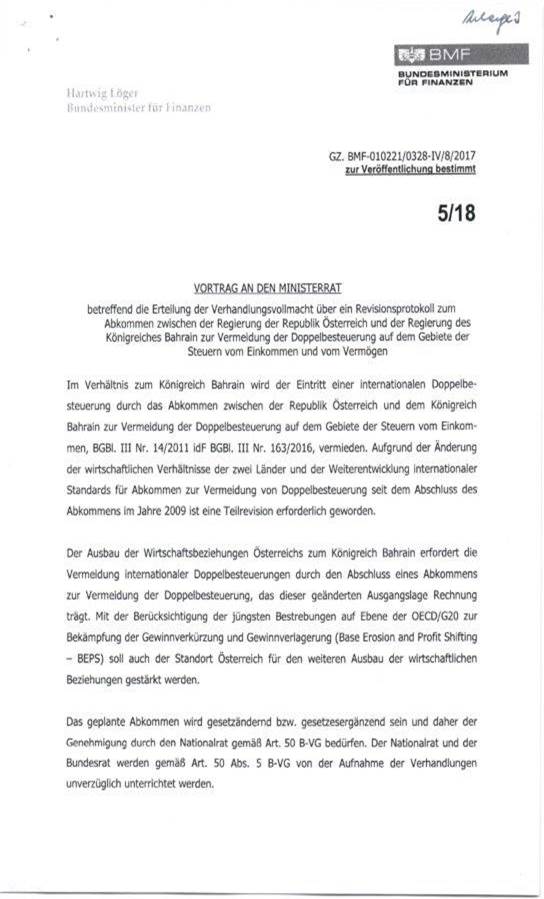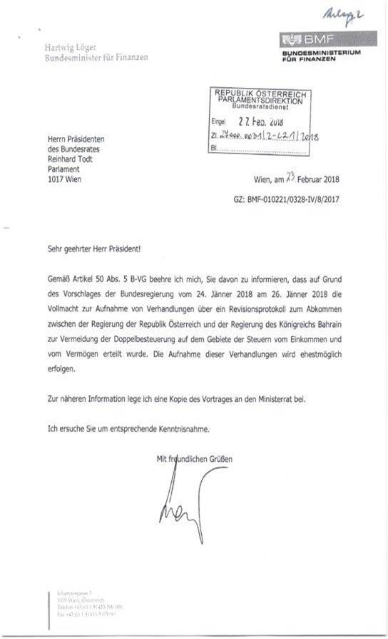 Schreiben des Bundesministers für Finanzen gemäß Art. 50 Abs. 5 B-VG betreffend Erteilung der Vollmacht zur Aufnahme von Verhandlungen über ein Revisionsprotokoll zum Abkommen zwischen der Regierung der Republik Österreich und der Regierung des Königreichs Bahrain zur Vermeidung der Doppelbesteuerung auf dem Gebiete der Steuern vom Einkommen und vom Vermögen ................................. 40