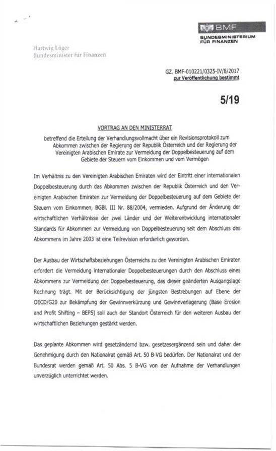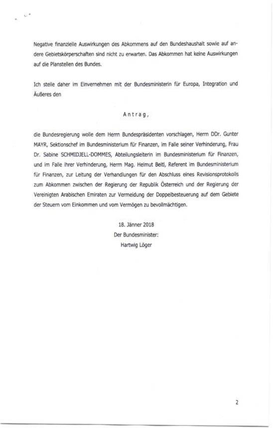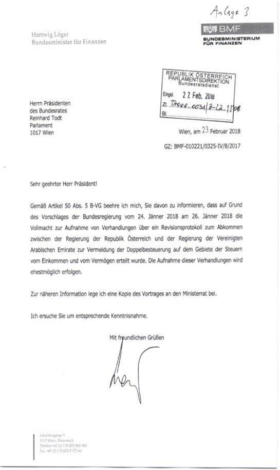 Schreiben des Bundesministers für Finanzen gemäß Art. 50 Abs. 5 B-VG betreffend Erteilung der Vollmacht zur Aufnahme von Verhandlungen über ein Revisionsprotokoll zum Abkommen zwischen der Regierung der Republik Österreich und der Regierung der Vereinigten Arabischen Emirate zur Vermeidung der Doppelbesteuerung auf dem Gebiete der Steuern vom Einkommen und vom Vermögen 43