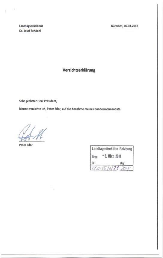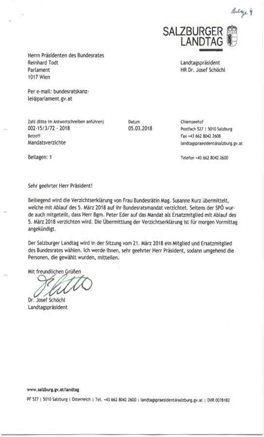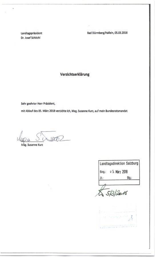 Schreiben des Präsidenten des Salzburger Landtages betreffend Mandatsverzicht der Bundesrätin Mag. Susanne Kurz sowie eines Ersatzmitgliedes des Bundesrates ........................... 46