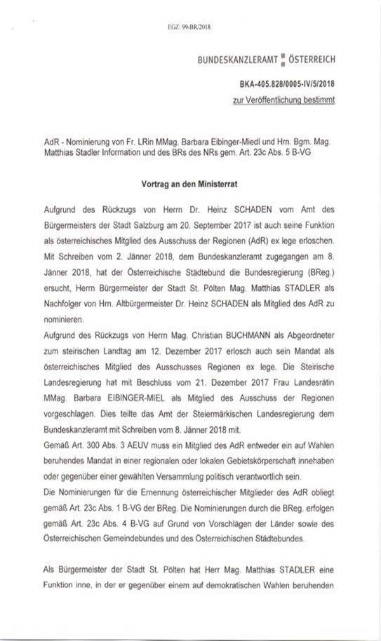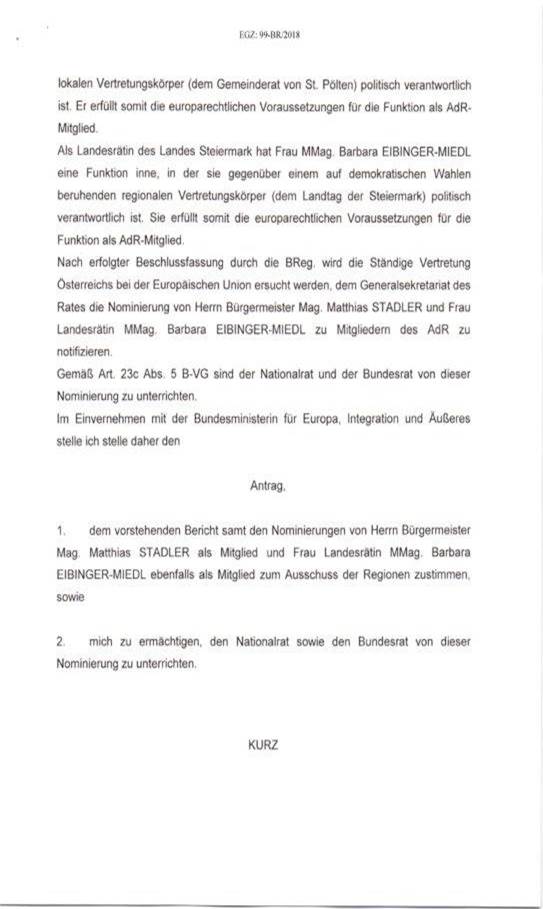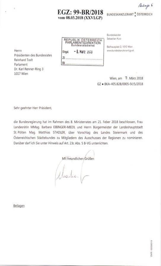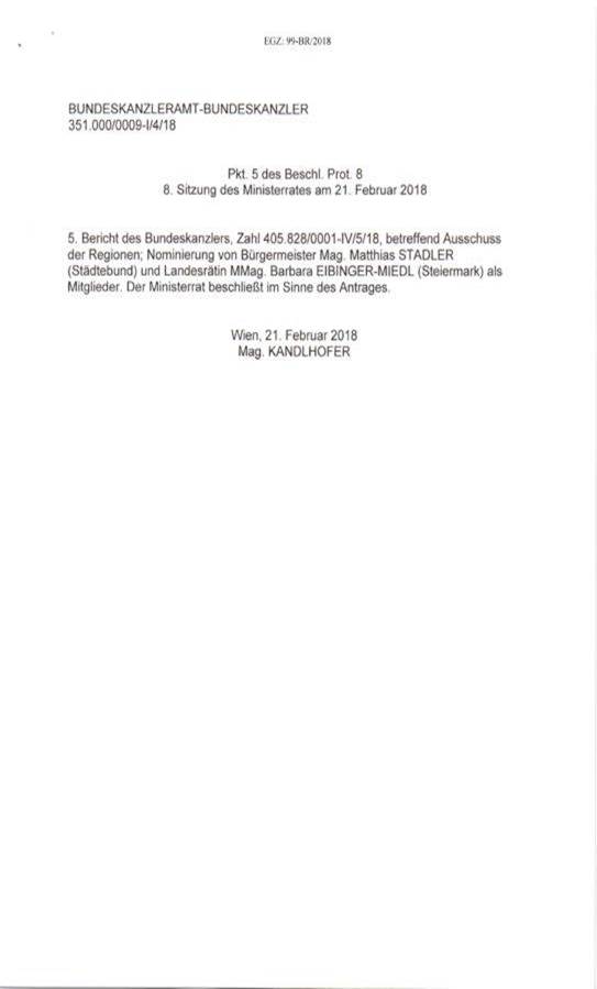 Schreiben des Bundeskanzlers Sebastian Kurz gemäß Art. 23c Abs. 5 B-VG betreffend Nominierung von Mitgliedern in den Ausschuss der Regionen .................................................................. 52