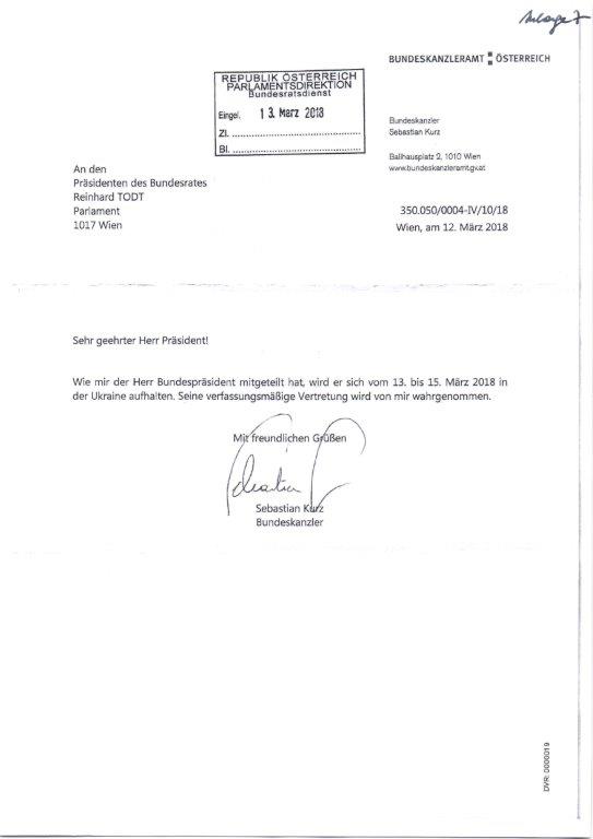 Schreiben des Bundeskanzlers Sebastian Kurz betreffend Vertretung von Bundespräsident Dr. Alexander Van der Bellen ................................................................................................................ 58