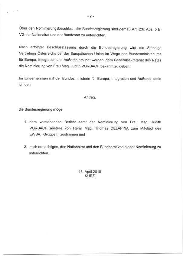 Schreiben des Bundeskanzlers Sebastian Kurz gemäß Art. 23c Abs. 5 B-VG betreffend Nominierung von Frau Mag. Judith Vorbach zum österreichischen Mitglied des Europäischen Wirtschafts- und Sozialausschusses (EWSA) ........................................................................................... 33