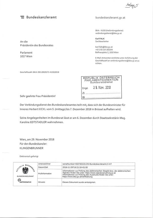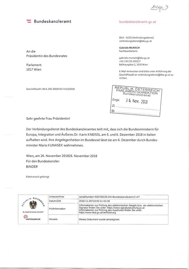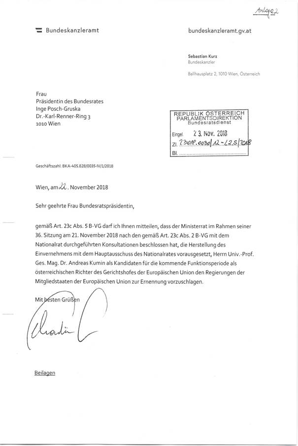 Schreiben des Bundeskanzlers Sebastian Kurz gemäß Art. 23c Abs. 5 B-VG betreffend den Vorschlag zur Ernennung von Herrn Universitätsprofessor Gesandten Mag. Dr. Andreas Kumin als österreichischen Richter des Gerichtshofes der Europäischen Union .................................................................. 29