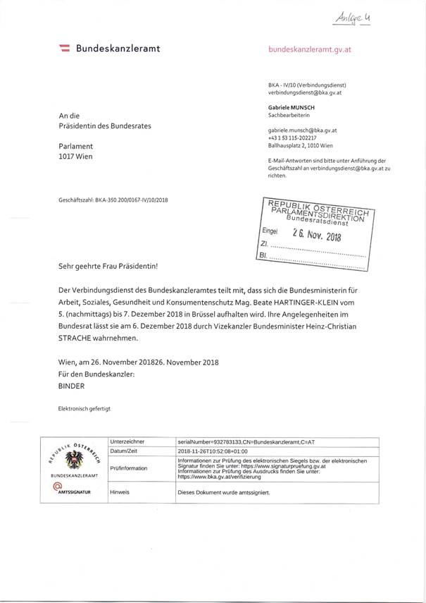 Schreiben des Verbindungsdienstes des Bundeskanzleramtes betreffend Aufenthalt von Mitgliedern der Bundesregierung in einem anderen Mitgliedstaat der Europäischen Union 31, 32, 33, 47