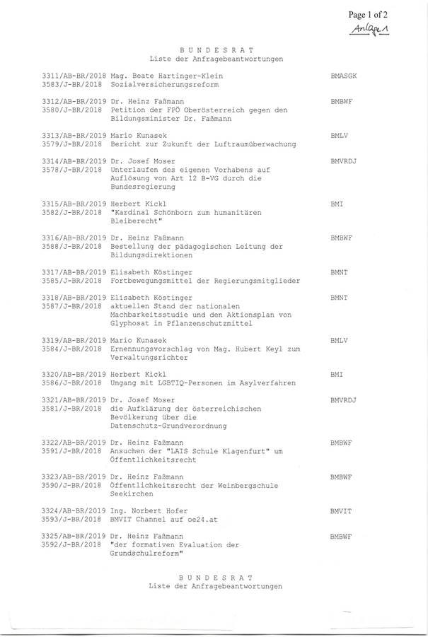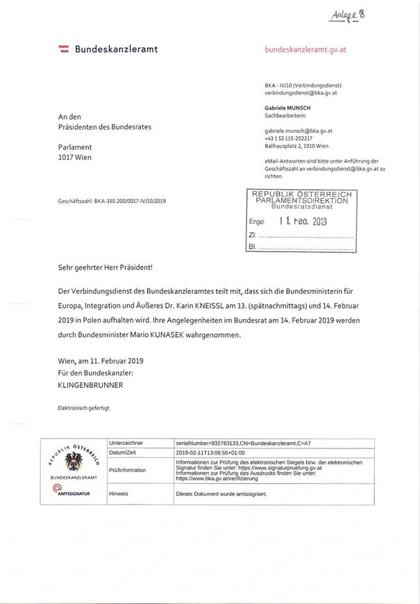 Die Einberufung der nächsten Sitzung des Bundesrates wird auf schriftlichem Weg erfolgen. Als Sitzungstermin wird Donnerstag, der 14. März 2019, 9 Uhr, in Aussicht genommen.