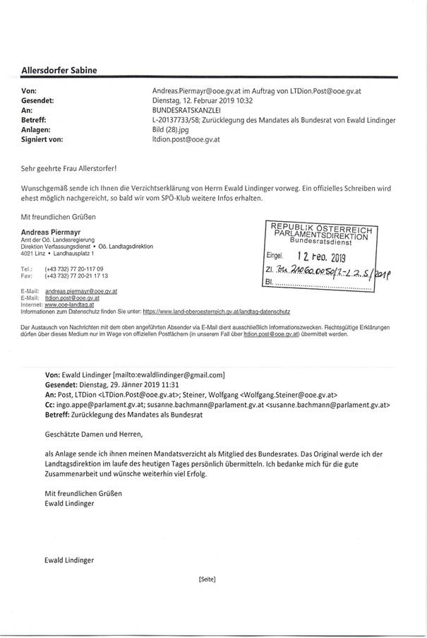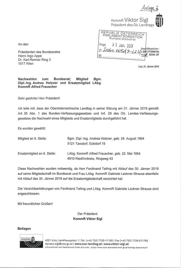 Schreiben des Präsidenten des Oberösterreichischen Landtages sowie des Amtes der Oberösterreichischen Landesregierung betreffend Mandatsverzicht der Bundesräte Ferdinand Tiefnig und Ewald Lindinger sowie eines Ersatzmitglieds des Bundesrates beziehungsweise Wahl eines Mitglieds und eines Ersatzmitglieds des Bundesrates ............................................................................................................. 52