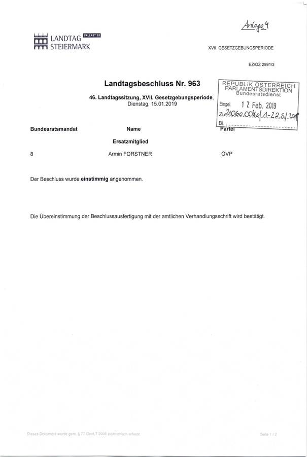 Schreiben der Präsidentin des Landtages Steiermark betreffend Mandatsverzicht des Bundesrates Armin Forstner, MPA beziehungsweise Wahl eines Ersatzmitglieds des Bundesrates .......... 55