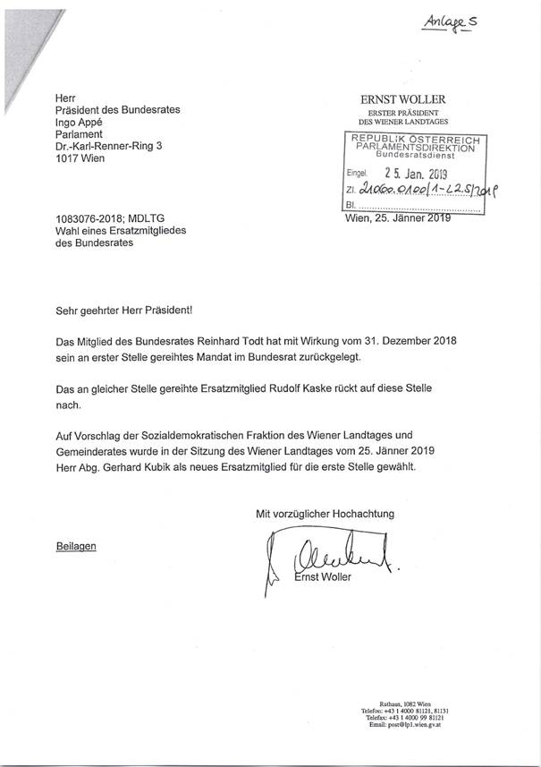 Schreiben des Ersten Präsidenten des Wiener Landtages betreffend Mandatsverzicht des Bundesrates Reinhard Todt beziehungsweise Wahl eines Ersatzmitglieds des Bundesrates .......... 57