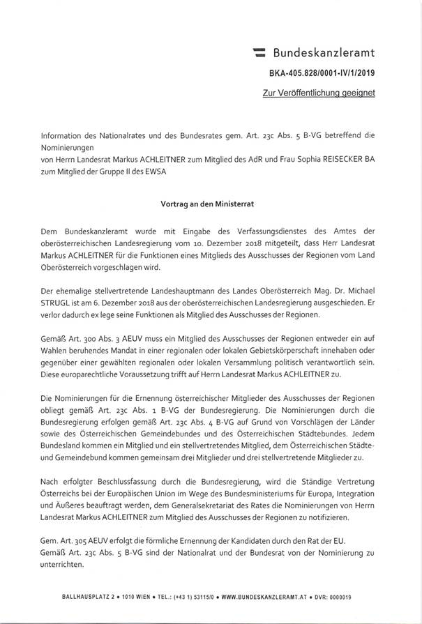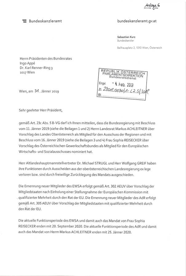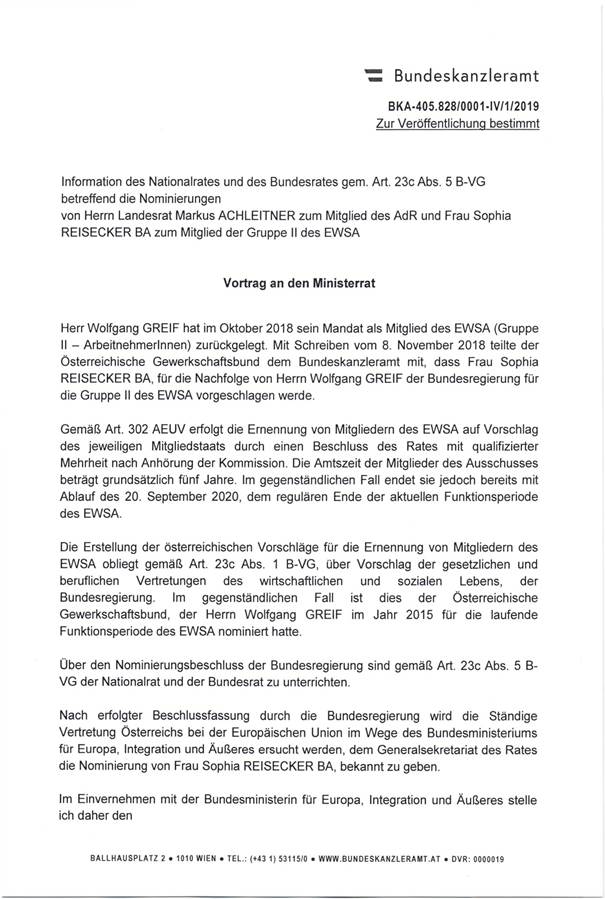 Schreiben des Bundeskanzlers Sebastian Kurz gemäß Art. 23c Abs. 5 B-VG betreffend Nominierung eines Mitglieds für den Ausschuss der Regionen beziehungsweise eines Mitglieds für den Europäischen Wirtschafts- und Sozialausschuss ...................................................................................................... 58