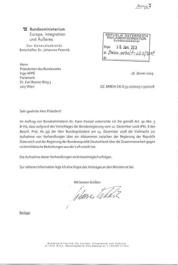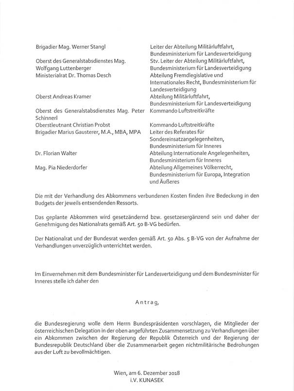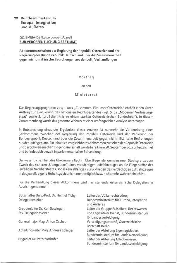Schreiben des Generalsekretärs des Bundesministeriums für Europa, Integration und Äußeres gemäß Art. 50 Abs. 5 B-VG betreffend Erteilung der Vollmacht zur Aufnahme von Verhandlungen über ein Abkommen zwischen der Regierung der Republik Österreich und der Regierung der Bundesrepublik Deutschland über die Zusammenarbeit gegen nichtmilitärische Bedrohungen aus der Luft durch den Bundespräsidenten ............................................................................................................................... 66