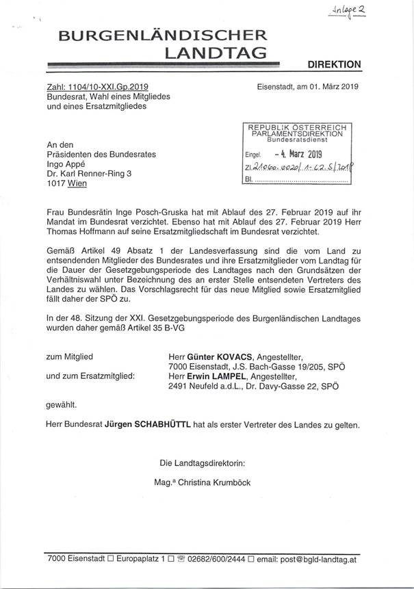 Der Ausschuss für Verfassung und Föderalismus stellt nach Beratung der Vorlage am 12. März 2019 den Antrag, den gemeinsamen Bericht des Bundeskanzlers und des