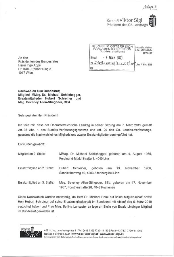 Schreiben des Präsidenten des Oberösterreichischen Landtages betreffend Mandatsverzicht des Bundesrates Dr. Michael Raml sowie eines Ersatzmitglieds des Bundesrates beziehungsweise Wahl eines Mitglieds und zweier Ersatzmitglieder des Bundesrates ................................................ 31