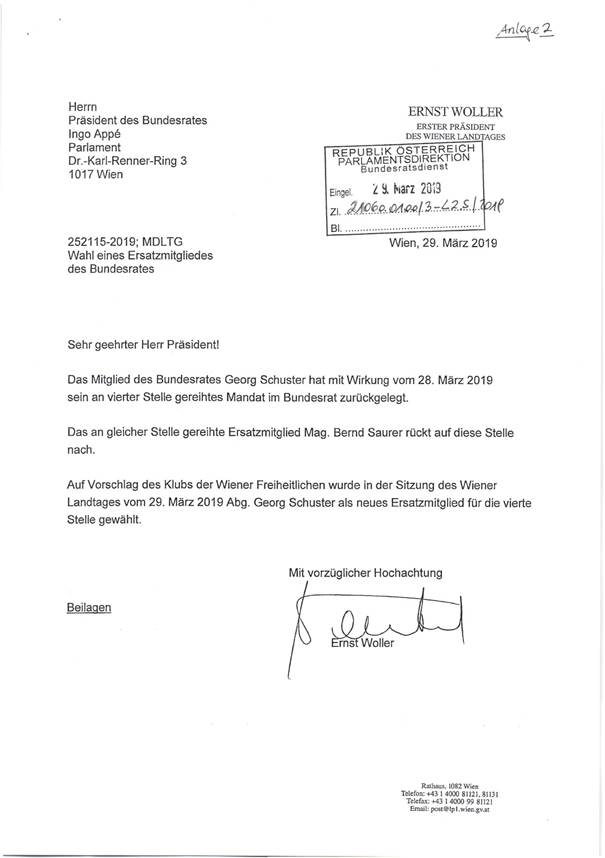 Schreiben des Ersten Präsidenten des Wiener Landtages betreffend Mandatsverzicht beziehungsweise Wahl eines Ersatzmitgliedes des Bundesrates ............................................................... 30