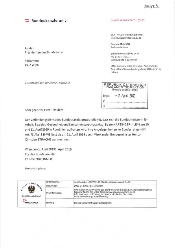 Die Einberufung der nächsten Sitzung des Bundesrates wird auf schriftlichem Wege erfolgen. Als Sitzungstermin wird Donnerstag, 9. Mai 2019, 9 Uhr, in Aussicht genommen.