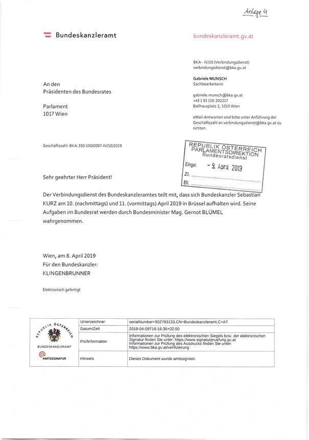 Schreiben des Bundeskanzleramtes betreffend Aufenthalt von Mitgliedern der Bundesregierung in einem anderen Mitgliedstaat der Europäischen Union ...................................................... 31, 32