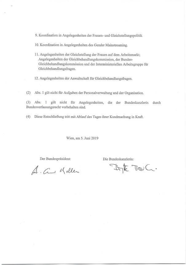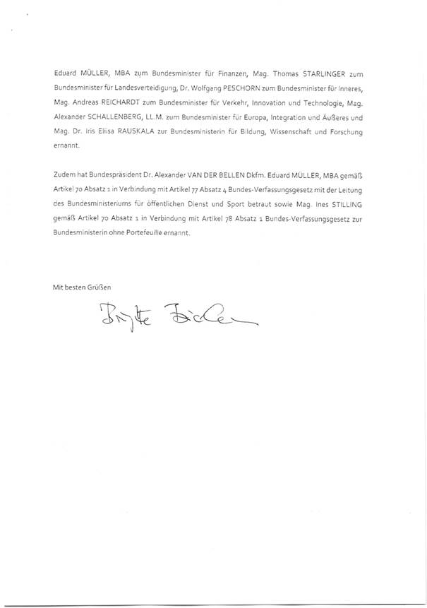 Ernennung von Frau Dr.in Brigitte Bierlein zur Bundeskanzlerin gemäß Art. 70 Abs. 1 B-VG beziehungsweise Ernennung von Herrn Univ.-Prof. Dr. Dr. h.c. Clemens Jabloner zum Vizekanzler und zum Bundesminister für Verfassung, Reformen, Deregulierung und Justiz, von Frau Mag.a Elisabeth Udolf-Strobl zur Bundesministerin für Digitalisierung und Wirtschaftsstandort, von Frau Dipl.-Ing.in Maria Patek, MBA zur Bundesministerin für Nachhaltigkeit und Tourismus, von Frau Mag.a Dr.in Brigitte Zarfl zur Bundesministerin für Arbeit, Soziales, Gesundheit und Konsumentenschutz, von Herrn Dipl.-Kfm. Eduard Müller, MBA zum Bundesminister für Finanzen, von Herrn Mag. Thomas Starlinger zum Bundesminister für Landesverteidigung, von Herrn Dr. Wolfgang Peschorn zum Bundesminister für Inneres, von Herrn Mag. Andreas Reichhardt zum Bundesminister für Verkehr, Innovation und Technologie, von Herrn Mag. Alexander Schallenberg, LL.M. zum Bundesminister für Europa, Integration und Äußeres und von Frau Mag.a Dr.in Iris Eliisa Rauskala zur Bundesministerin für Bildung, Wissenschaft und Forschung gemäß Art. 70 Abs. 1 B-VG und weiters