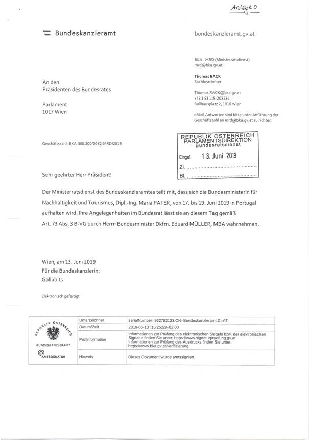 den Aufenthalt der Frau Bundesministerin für Nachhaltigkeit und Tourismus, Dipl.-Ing.in Maria Patek vom 17. bis 19. Juni 2019 in Portugal bei gleichzeitiger Wahrnehmung ihrer Angelegenheiten im Bundesrat gemäß Art. 73 Abs. 3 B-VG durch Herrn Bundesminister Dkfm. Eduard Müller, MBA (Anlage 5).