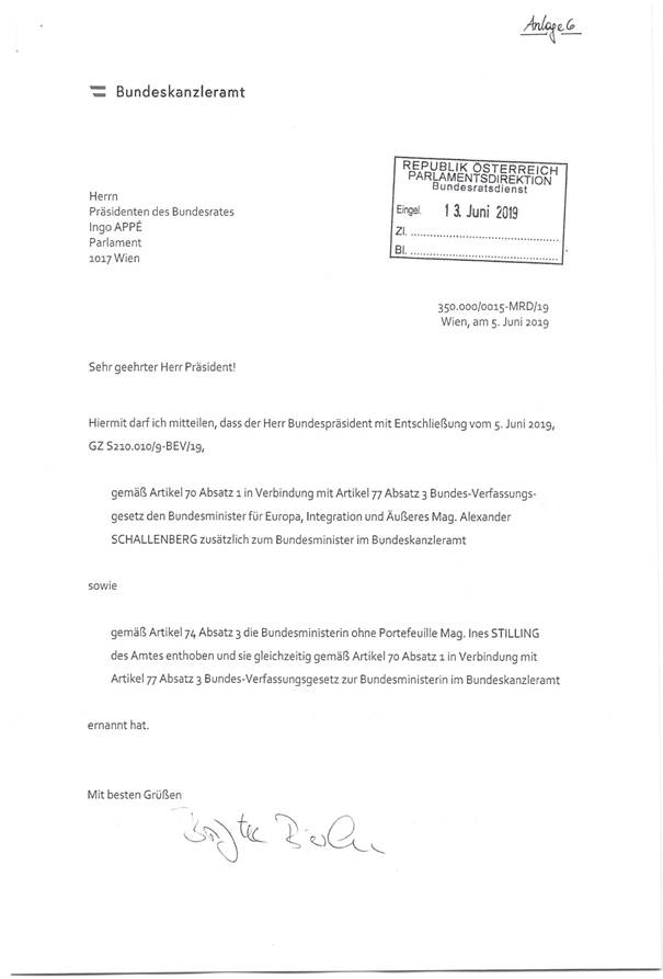 Enthebung von Frau Bundesministerin ohne Portefeuille Mag.a Ines Stilling des Amtes gemäß Art. 74 Abs. 3 und gleichzeitige Ernennung zur Bundesministerin im Bundeskanzleramt gemäß Art. 70 Abs. 1 in Verbindung mit Art. 77 Abs. 3 B-VG durch den Herrn Bundespräsidenten