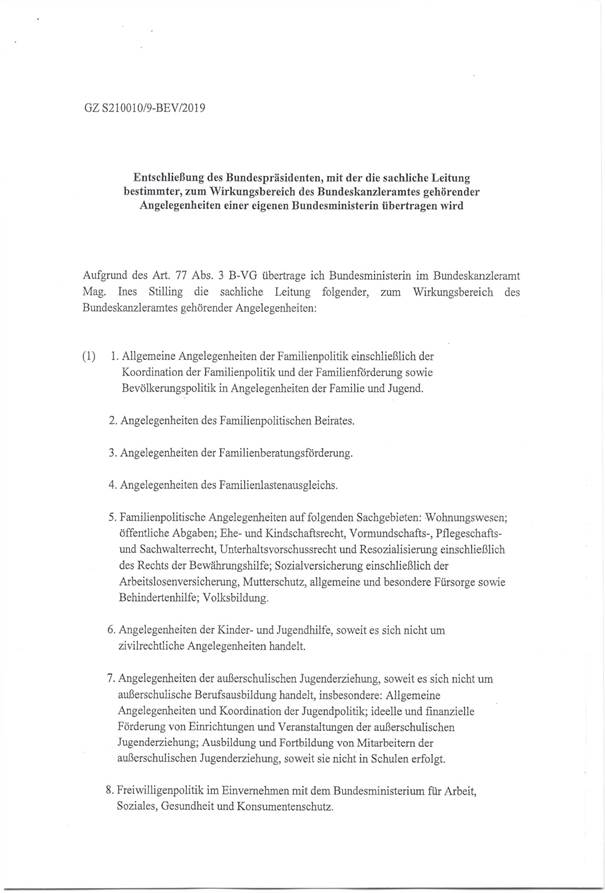 Enthebung von Frau Bundesministerin ohne Portefeuille Mag.a Ines Stilling des Amtes gemäß Artikel 74 Absatz 3 und gleichzeitige Ernennung zur Bundesministerin im Bundeskanzleramt gemäß Artikel 70 Absatz 1 in Verbindung mit Artikel 77 Absatz 3 Bundes-Verfassungsgesetz