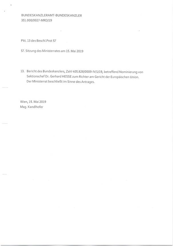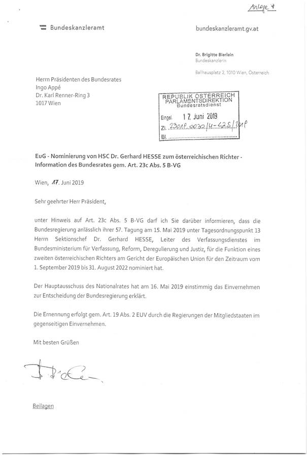 Unterrichtung des Bundeskanzleramtes gemäß Art. 23c Abs. 5 B-VG betreffend Nominierung von Herrn Sektionschef Dr. Gerhard Hesse, Leiter des Verfassungsdienstes im Bundesministerium für Verfassung, Reformen, Deregulierung und Justiz, für die Funktion eines zweiten österreichischen Richters am Gericht der Europäischen Union für den Zeitraum vom 1. September 2019 bis 31. August 2022 (Anlage 7)
