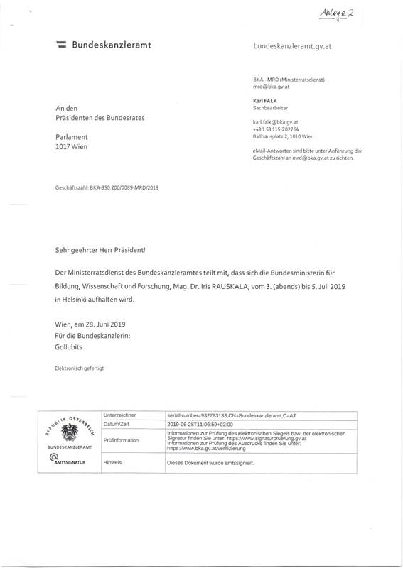 den Aufenthalt von Frau Bundesministerin für Bildung, Wissenschaft und Forschung, Mag. Dr. Iris Rauskala, vom 3. (abends) bis 5. Juli 2019 in Helsinki (Anlage 2)
